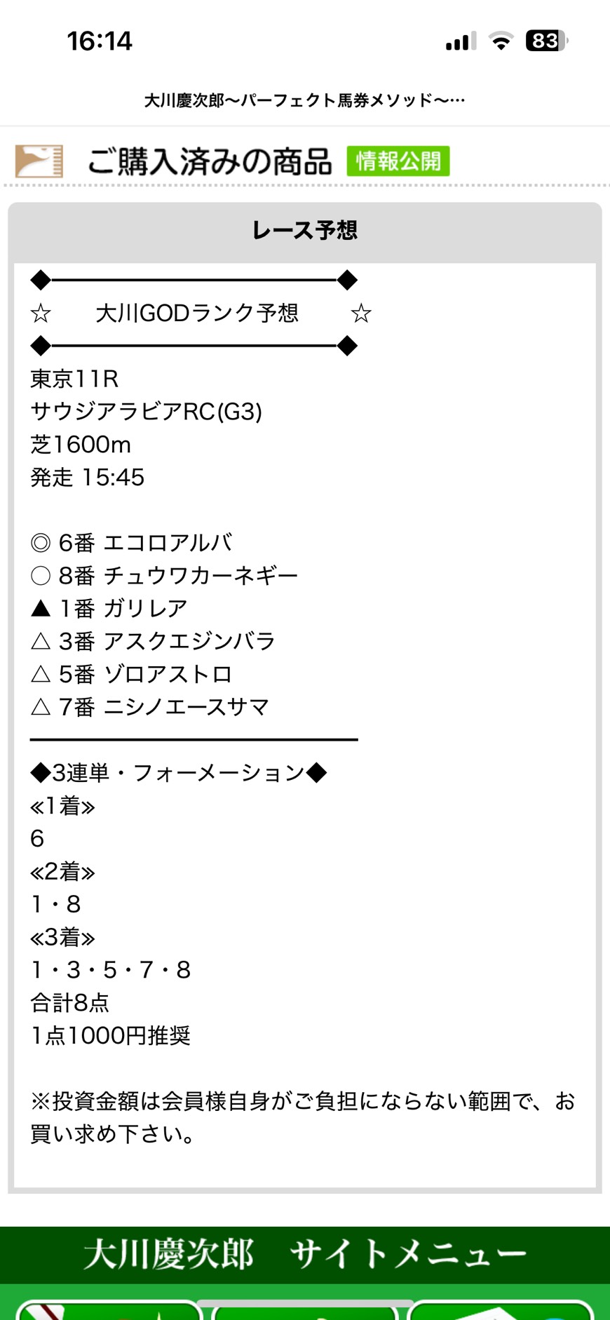 大川慶次郎が無料予想で三連単を買い目点数6点で的中