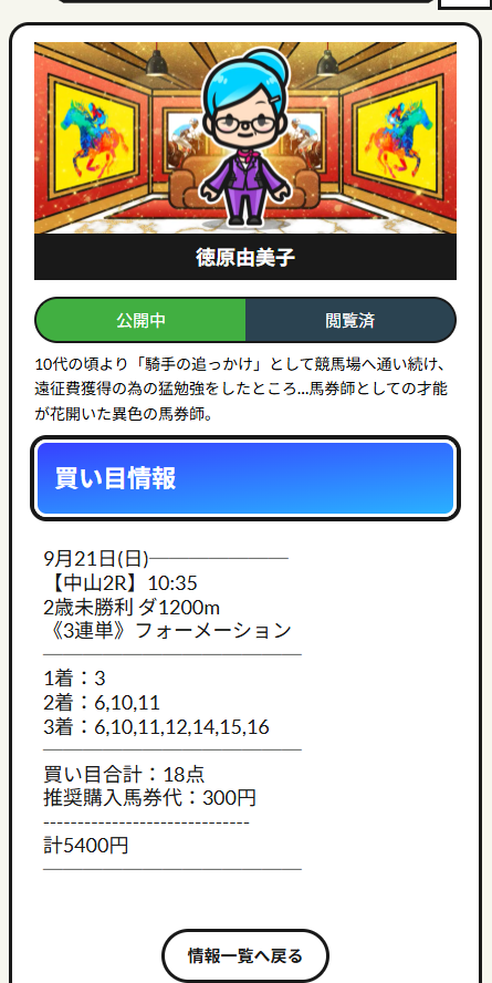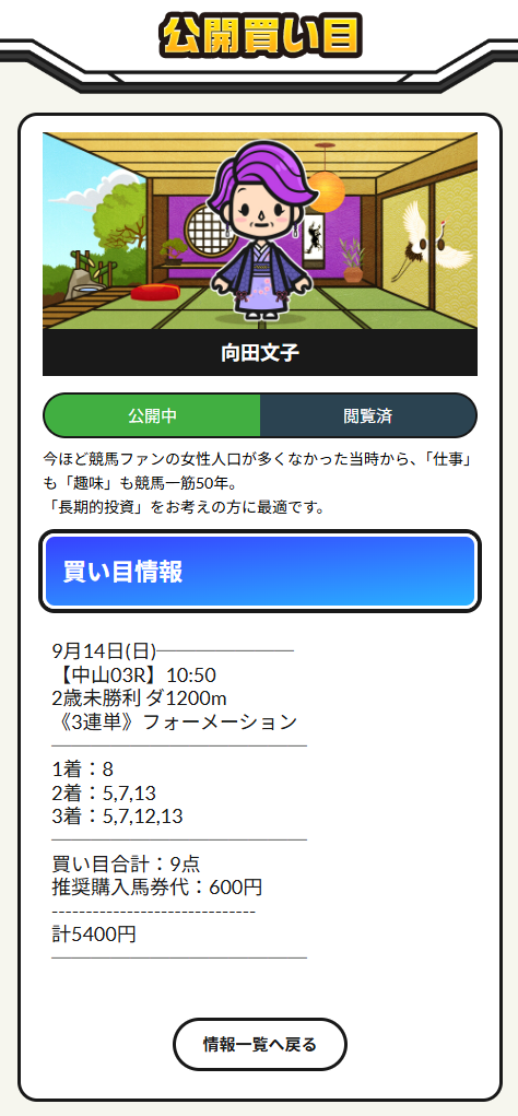 三連休は競馬女子界のジョセフジョースターこと向田文子の有料予想を購入しました。