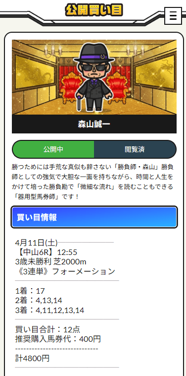 こういうのを見ると、やっぱり森山誠一プランは「当てた」より「どう当てたか」が強いです。人気サイドの軸で安心感を残しながら、最後は17番人気までちゃんと拾って、配当総額は69万4080円。未勝利戦って、上位人気だけで固めると案外伸びないのに、森山誠一プランはそこを分かったうえで配当になる形を作ってるんですよね。自分は競馬好きなので、こういう“穴を入れる場所のうまさ”を見ると素直に唸ります。変に夢だけ見せるんじゃなく、買い目のセンスで納得させてくる情報でした。