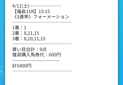 私は最初、バイアスナビって名前を見ても半信半疑でした。競馬って結局、うまく言う人はいくらでもいるので。でも4月11日の福島11Rで1→15→11、3連単98,200円を出されると、さすがに見方が変わります。こちらは画像の通り5,400円しか入れていなかったのに、払戻は589,200円。この「増え方」はやっぱり大きいです。馬のことを細かく語れるタイプではないんですが、それでも分かるのは、適当に夢だけ見せる情報じゃなく、ちゃんとお金の形にして返してくれたということ。バイアスナビは、変に熱くならなくても続けたくなる情報でした。