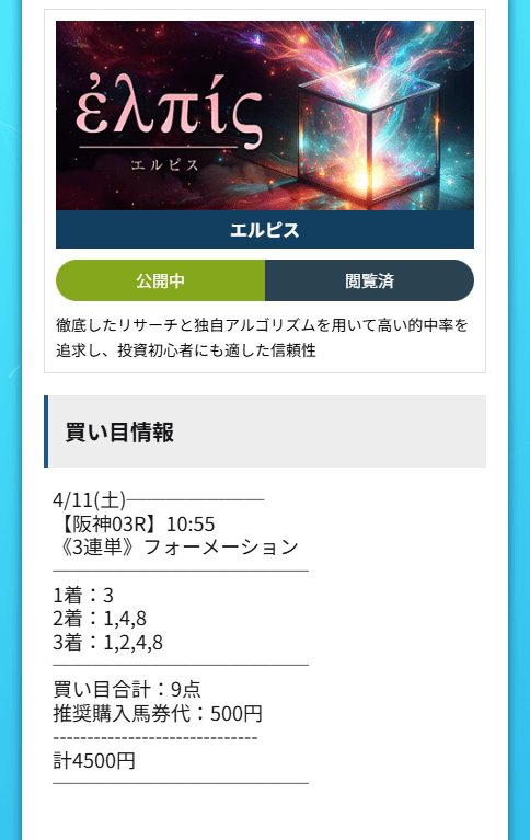夜勤明けって、頭はぼんやりしてるのに、支払いのことだけは妙にリアルなんですよね。看護師やってると収入はあっても、疲れた勢いでお金が飛ぶことも多いので、最近は使い方をかなり気にするようになりました。そんな中で見たエルピスの結果は、けっこう救いでした。4月11日阪神3Rで3→8→4、3連単は41,520円。私は4,500円で入っていたので、払戻は207,600円。しかも2着の8番は8番人気、3着の4番は6番人気で、ただ無難に寄せた感じじゃなかったのが良かったです。疲れて帰って、そのまま寝るだけのはずの日に、エルピスのおかげでちょっと呼吸が楽になりました。こういう「現実に効く的中」がいちばんありがたいです。