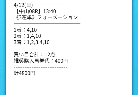 保育の仕事をしてると、気を張る時間が長いぶん、休憩中にスマホを見る数分がちょっとした逃げ場なんです。そのタイミングで見たシンギュラリティの結果、ちょっと声が出ました。4月12日の中山8Rで決着は10→4→1、3連単は55,060円。しかも1着の10番が5番人気、2着の4番が9番人気だったので、「堅いところだけ並べた買い目じゃないんだな」とすぐ分かりました。私は4,800円で入っていたから、払戻は220,240円。何日も我慢して使わなかったお金が、こういう形で返ってくると、ちょっと自分を甘やかしてもいいかなって思えます。シンギュラリティは、気持ちまで貧しくなる時期にありがたい情報でした。
