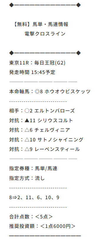 毎日王冠無料予想で馬連買い目点数6点で的中