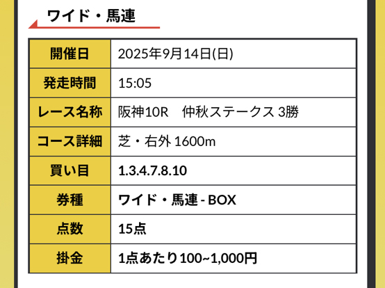 15日(月)の無料予想阪神10Rで馬連・ワイドのダブル的中