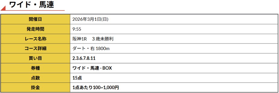 1日(日)阪神1Rで馬連ワイドの2馬券種的中