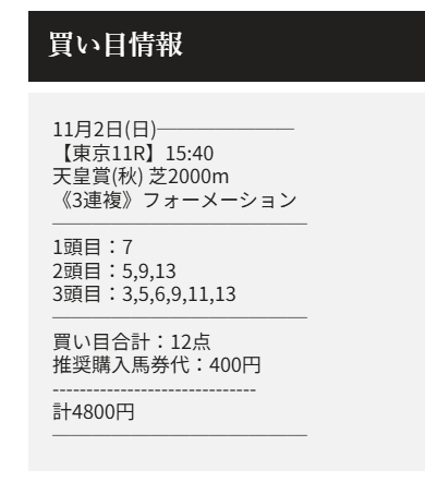 メールが来てすぐ登録を済ませて無料予想指定通りの天皇賞(秋)の馬券を買ったら