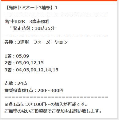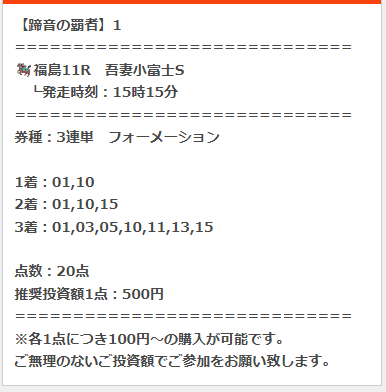 福島11Rの吾妻小富士ステークスで49万1000円、中山11Rのニュージーランドトロフィーで29万5700円。配当総額は78万6700円。